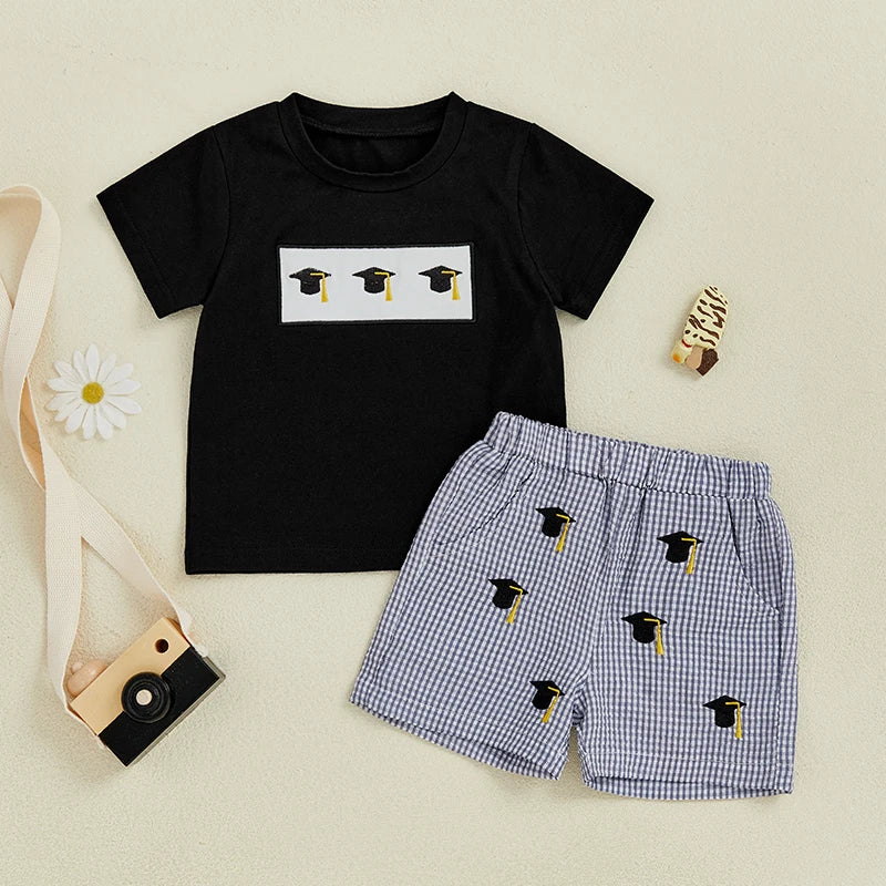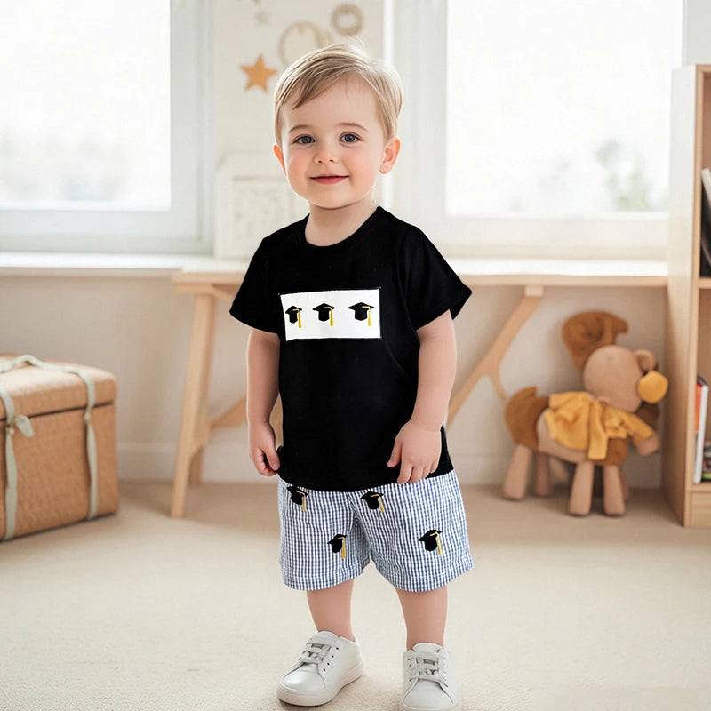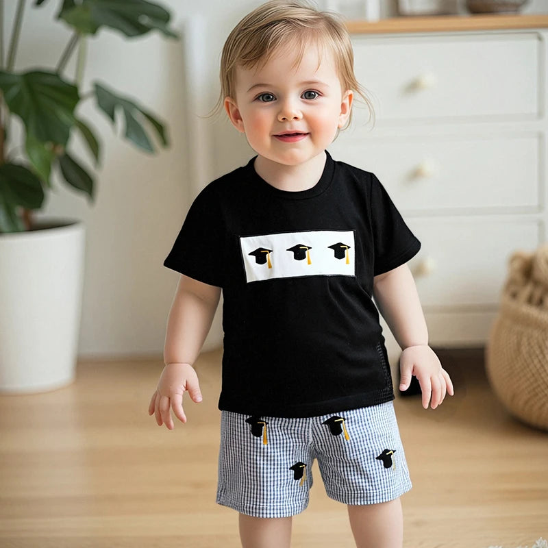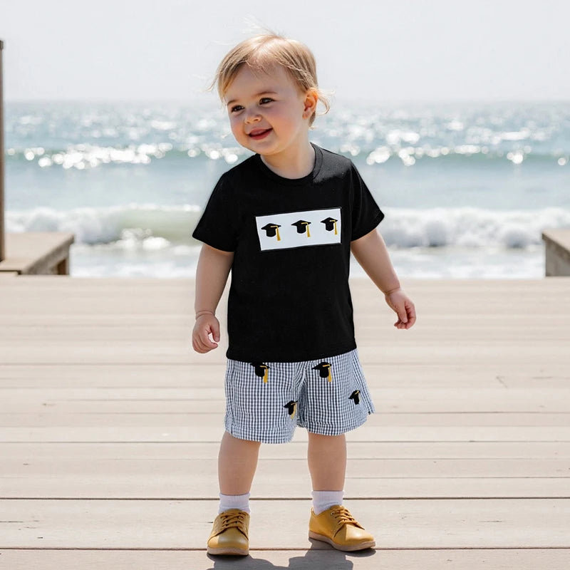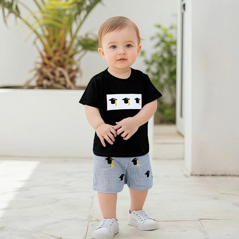 Baby Graduation Cap Outfit Set — Embroidered Tee & Plaid Shorts for Girls & Boys (6M–4Y)