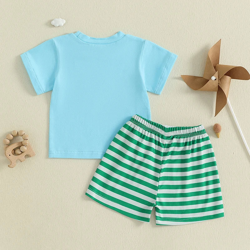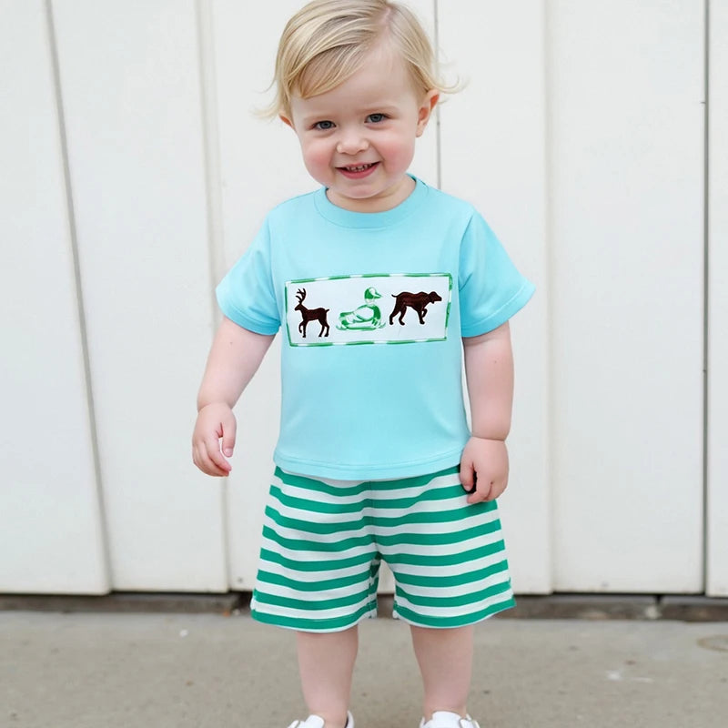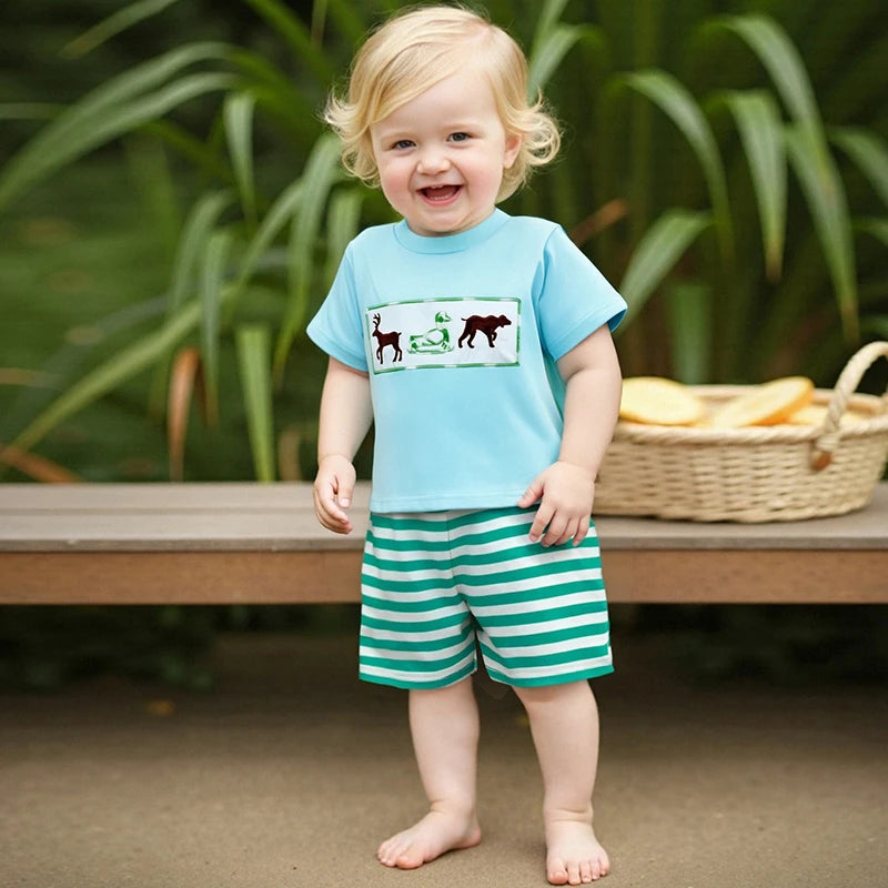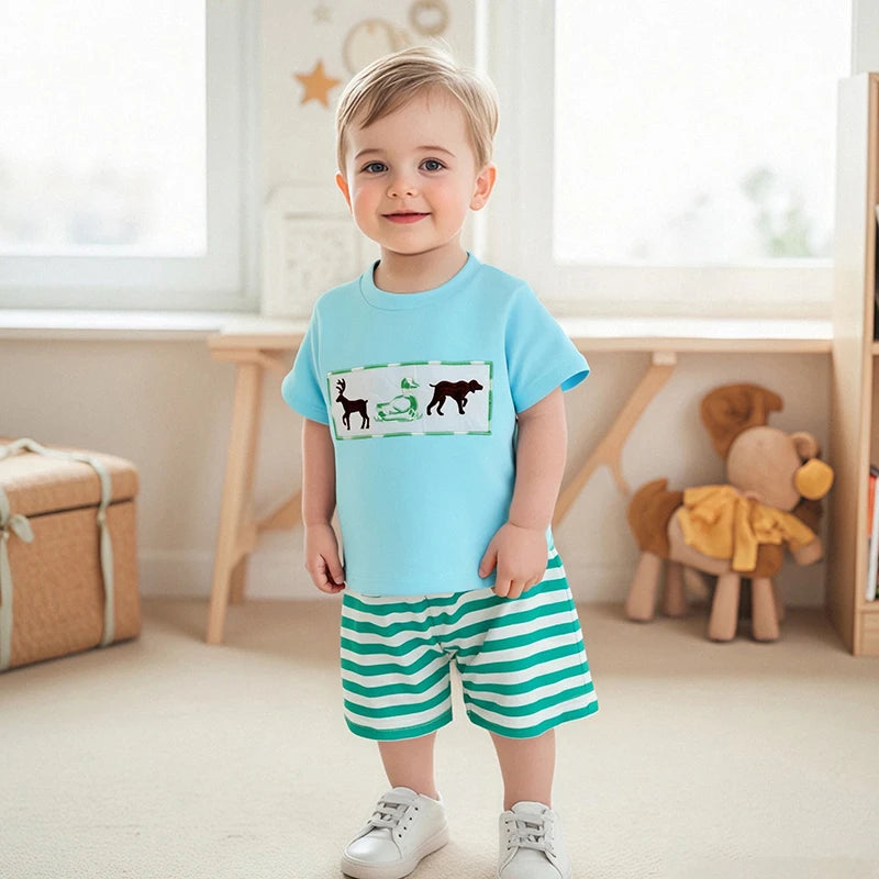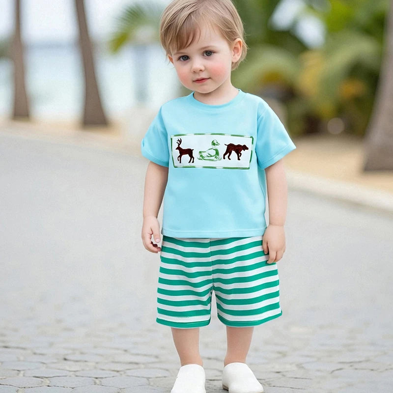 Toddler Boys Animal Embroidery Summer Set – Cotton T-Shirt & Stripe Shorts (2PC)